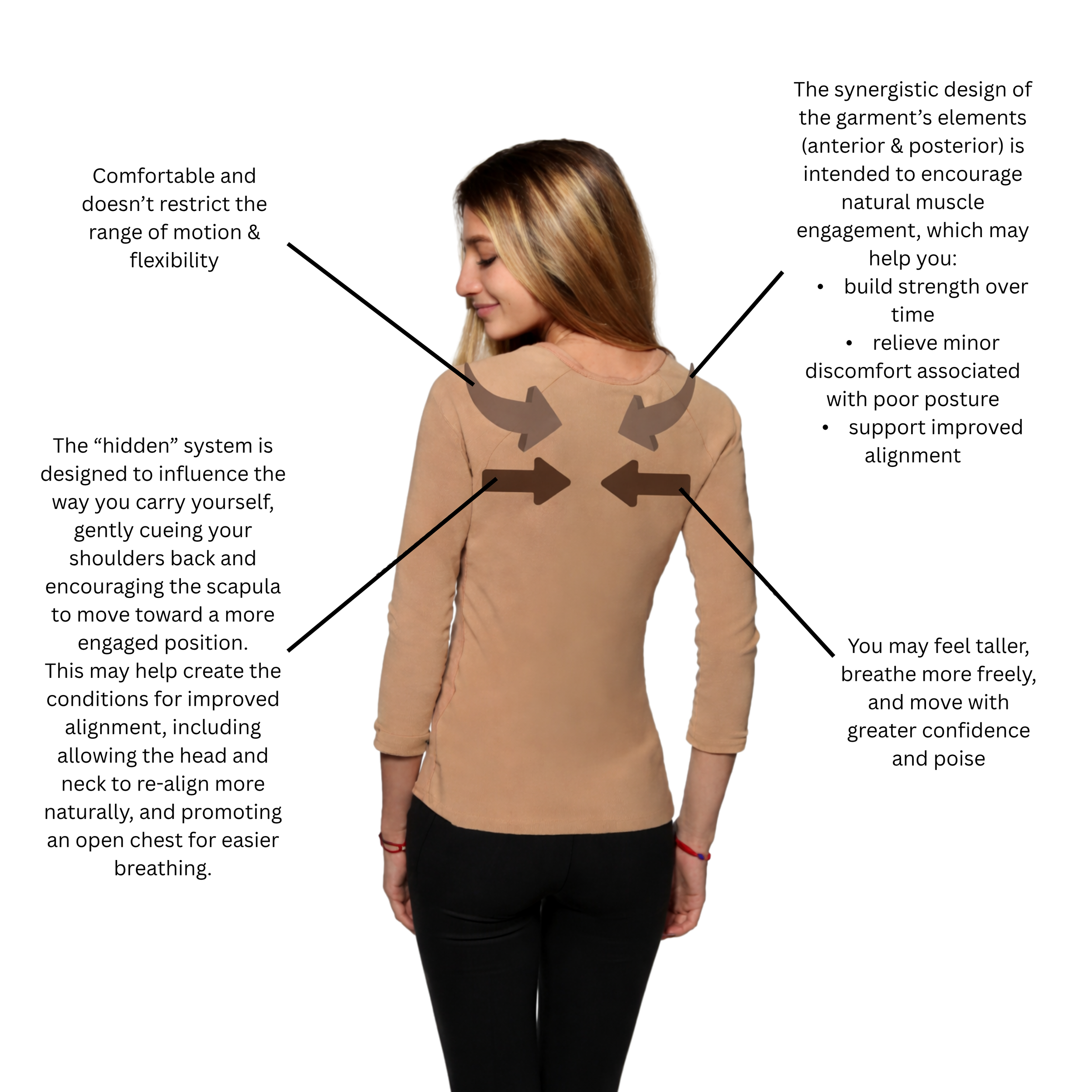 Bella Posture Wear combines cutting-edge, patent-pending technology with a stylish, wearable design to gently guide your body into proper alignment. Unlike stiff braces that restrict movement, our garment works with your body, encouraging muscle engagement and strength without discomfort or rigidity.